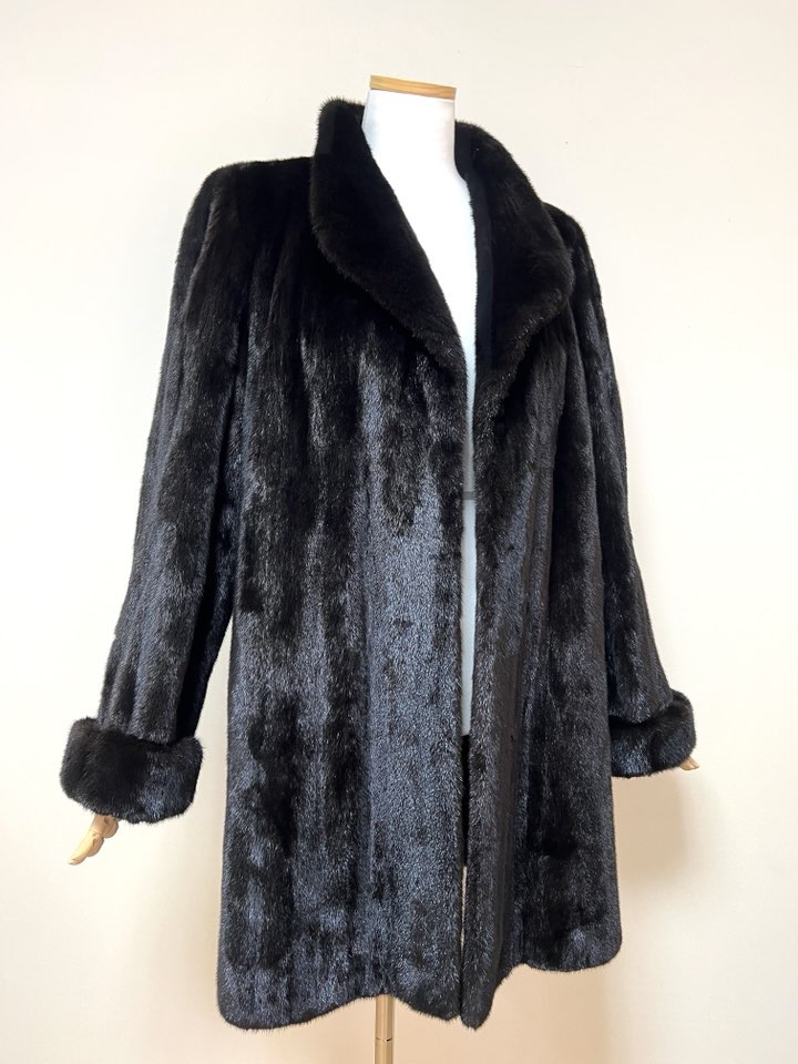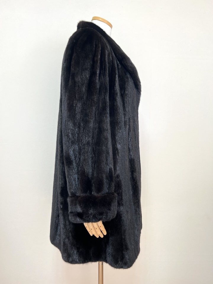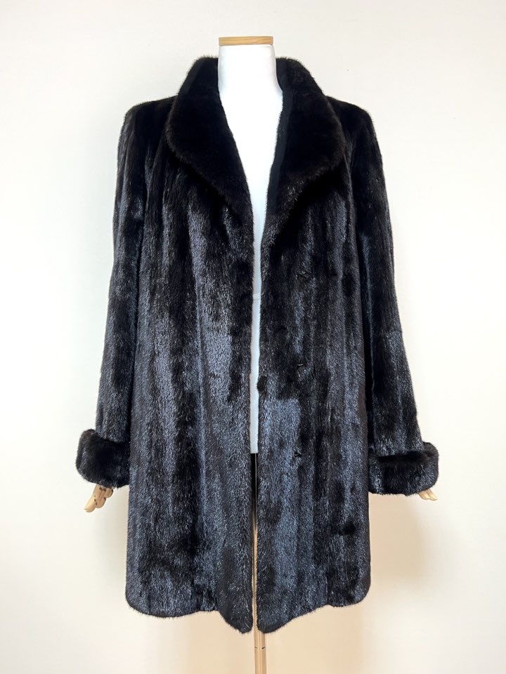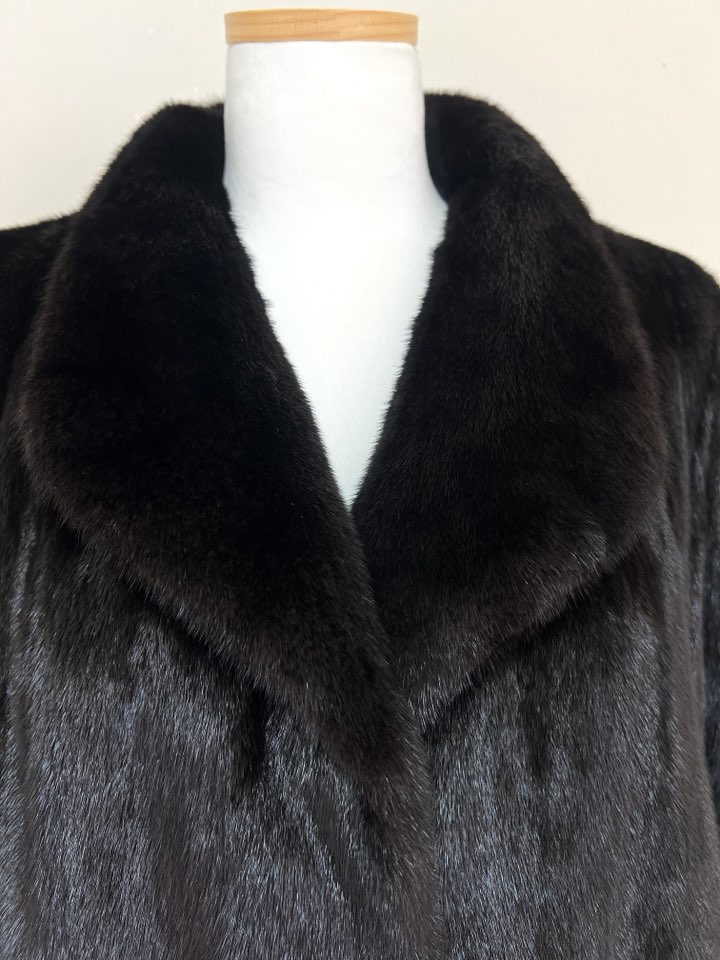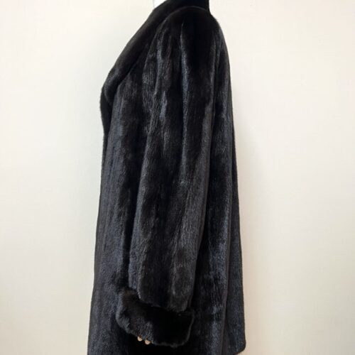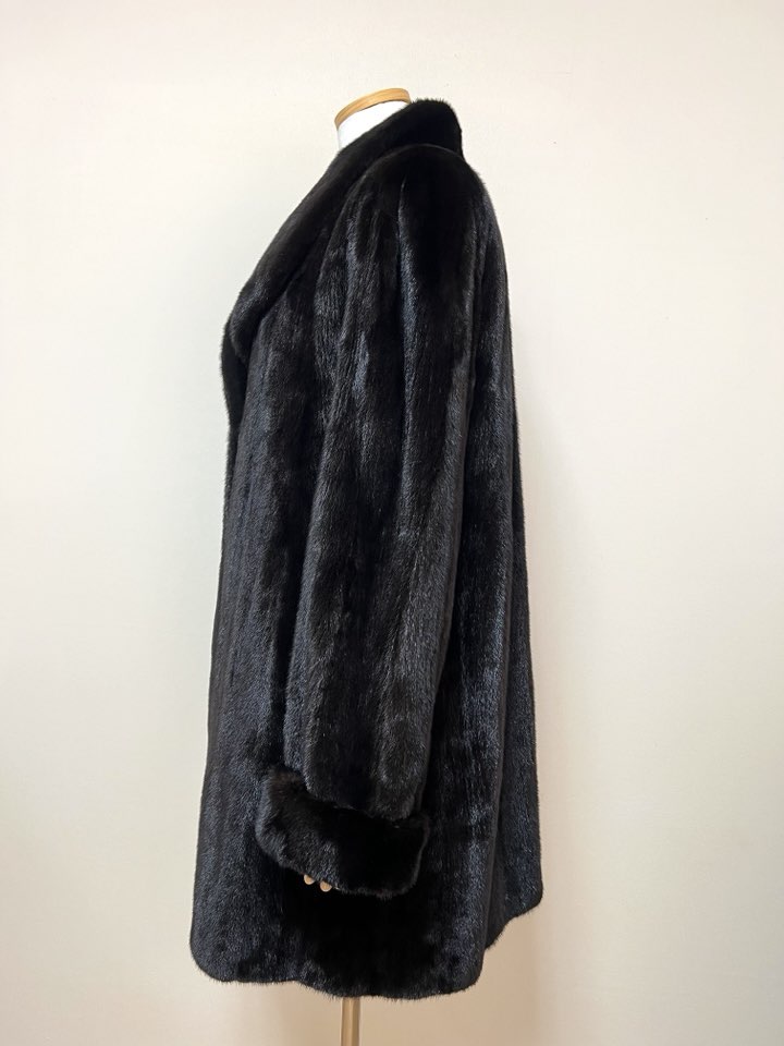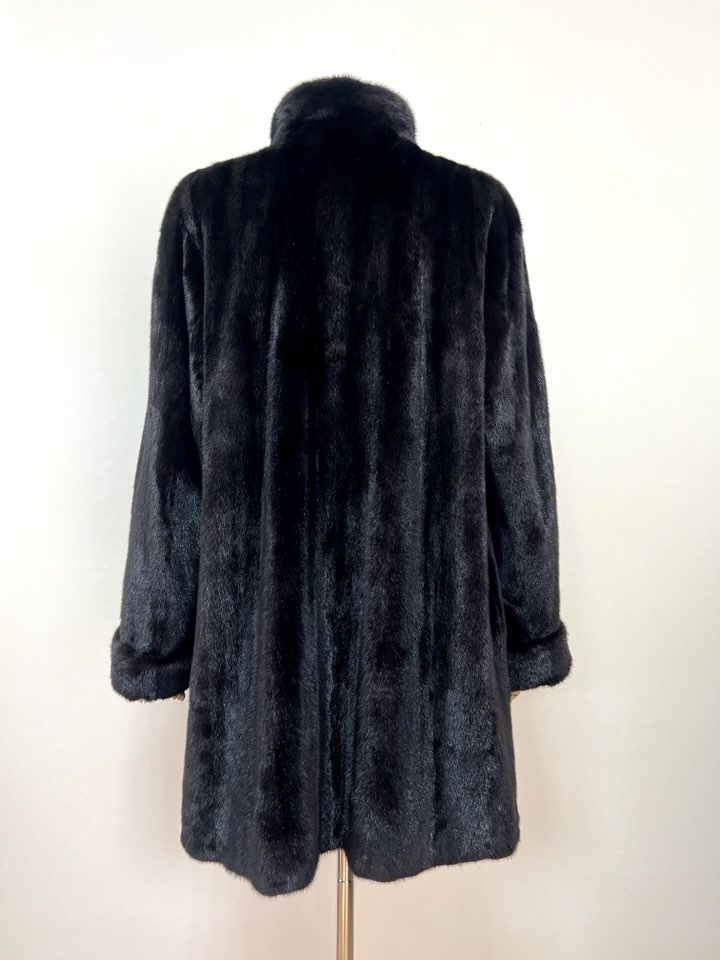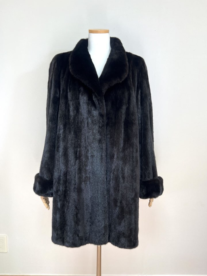 힙선을 적당히 덮어 주는 기장의 풀스킨 밍크 코트 입니다(중간길이 코트)