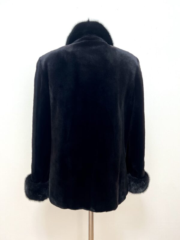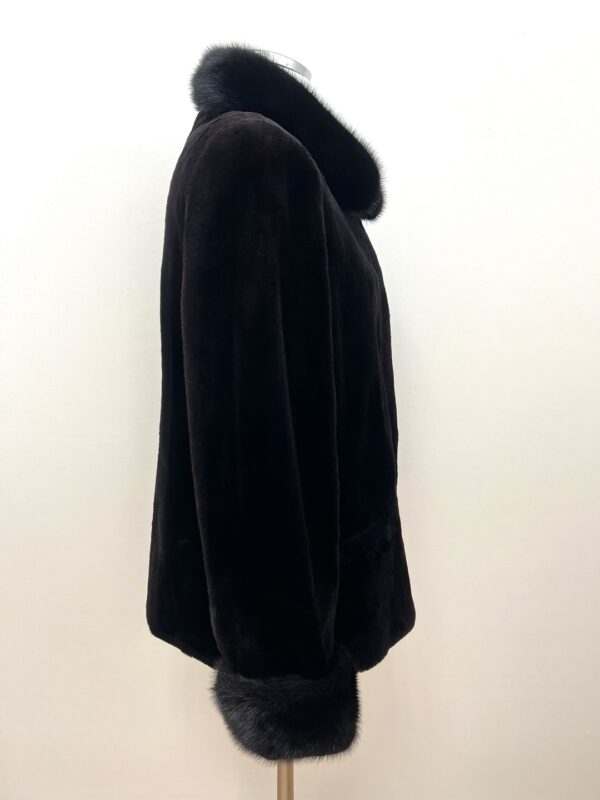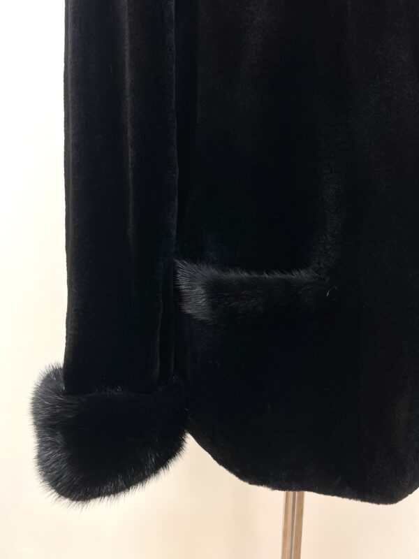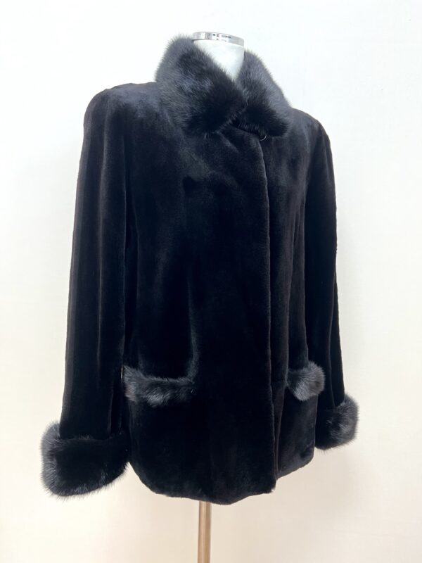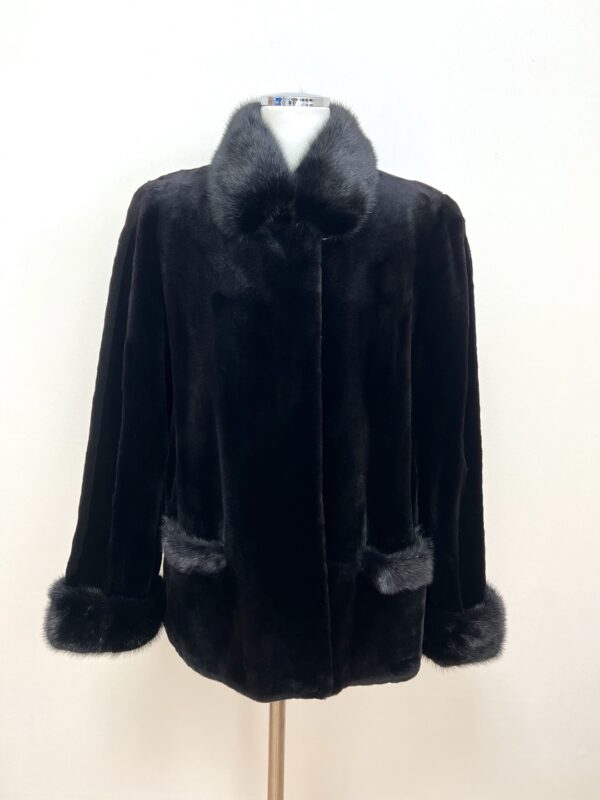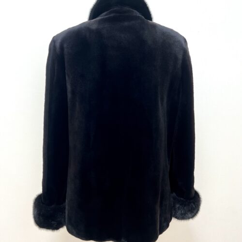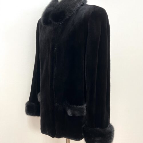 풀스킨 쉬어드 밍크코트에 밋밋하지 않게 목과 소매,포켓부분에 밍크퍼로 볼륨감을 넣은 디자인 입니다.
